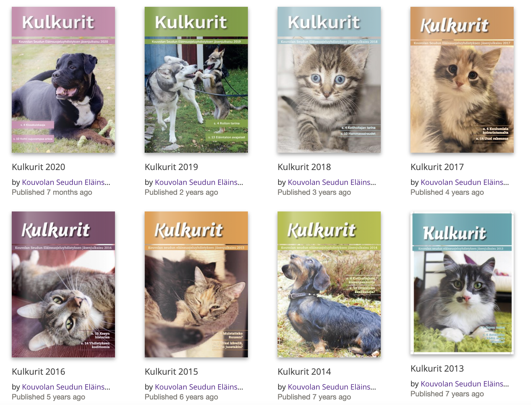 Kaikki julkaistavat jutut liittyvät aina suoraan yhdistyksen kautta luovutettujen eläinten tarinoihin, eläinten hyvinvointiin tai tietämyksen lisäämiseen eläinten oikeanlaisesta kohtelusta. Lehteä jaetaan maksutta tapahtumissamme, markkinoilla myyntipöydissämme, eläintalollamme, eläinlääkärien vastaanotoilla, eläinkaupoissa Kouvolan alueella, ja Korian ja Elimäen S-Marketeissa. Lehtiä annetaan myös eläinten adoptoijien tai katsojien mukaan. Lehti saa näkyvyyttä myös sosiaalisen median jaoilla ja linkitettynä kotisivuillamme.